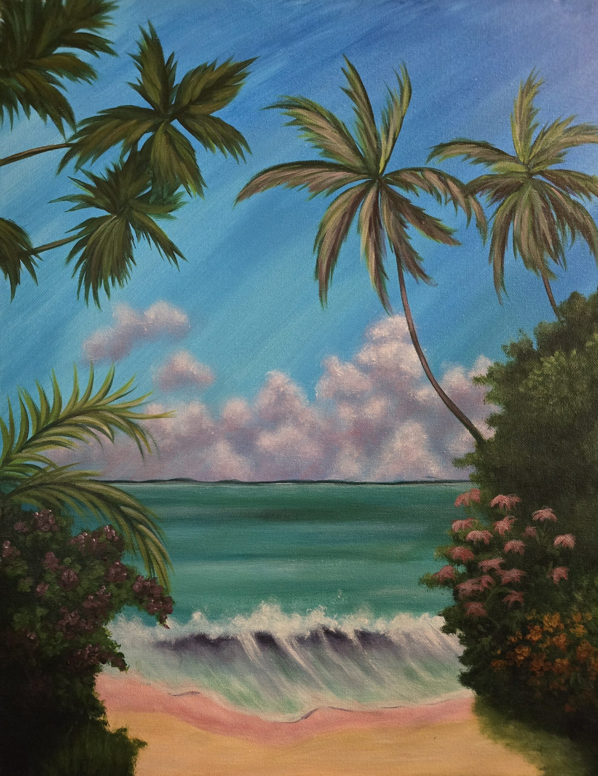 This original hand-painted piece invites the viewer to step into a tranquil, secluded beach scene. Its a perfect addition for those who love the seaside or the tropics! Gallery wrapped and easily frameable.